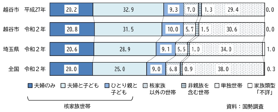越谷市は、全国や埼玉県に比べて、核家族の子育て世帯が多い地域です(図1)。