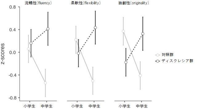 その結果、小学生の段階ではディスレクシア群と対照群の間に大きな差は見られませんでした。しかし、中学生になると、特に「柔軟性(flexibility)」において、ディスレクシア群のほうが高い傾向が見られました。